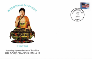 「國際衛塞節」是聯合國決議,世界公認的紀念釋迦佛陀的節日,在2019年的「國際衛塞節」,美國郵政總局用H.H.第三世多杰羌佛佛像發行了佛陀蓮台打坐的首日封。除此之外,從2019年開始,世界上有60多個國家為了推崇H.H.第三世多杰羌佛崇高的道德品質以及無私、慈悲的精神,發行了H.H.第三世多杰羌佛紀念郵票,這是佛教史上的一大盛事。
